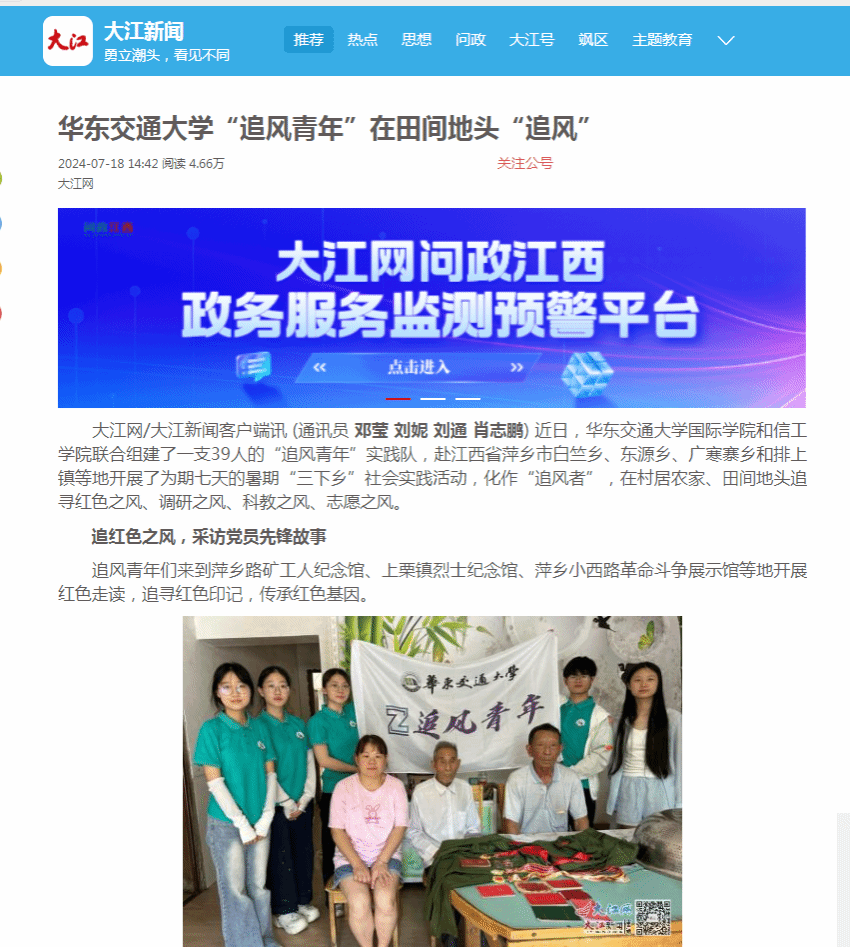近日,beat365中文唯一官网国际学院和信工学院联合组建了一支39人的“追风青年”实践队,赴江西省萍乡市白竺乡、东源乡、广寒寨乡和排上镇等地开展了为期七天的暑期“三下乡”社会实践活动,化作“追风者”,在村居农家、田间地头追寻红色之风、调研之风、科教之风、志愿之风。