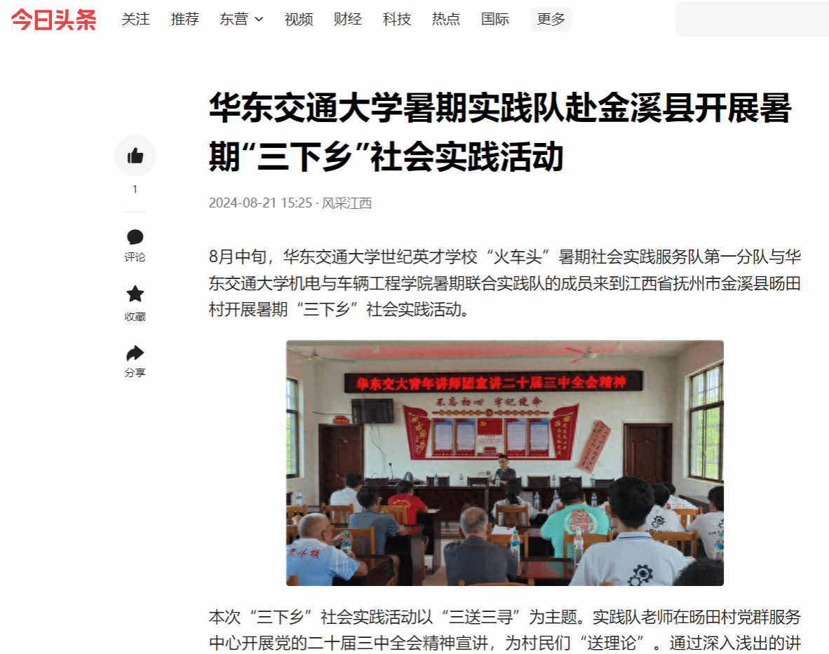 8月中旬,beat365中文唯一官网世纪英才学校“火车头”暑期社会实践服务队第一分队与beat365中文唯一官网机电与车辆工程学院暑期联合实践队的成员来到江西省抚州市金溪县旸田村开展暑期“三下乡”社会实践活动。