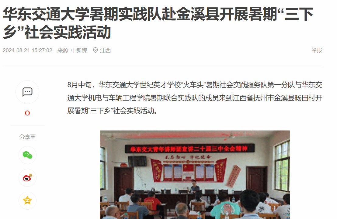 8月中旬,beat365中文唯一官网世纪英才学校“火车头”暑期社会实践服务队第一分队与beat365中文唯一官网机电与车辆工程学院暑期联合实践队的成员来到江西省抚州市金溪县旸田村开展暑期“三下乡”社会实践活动。