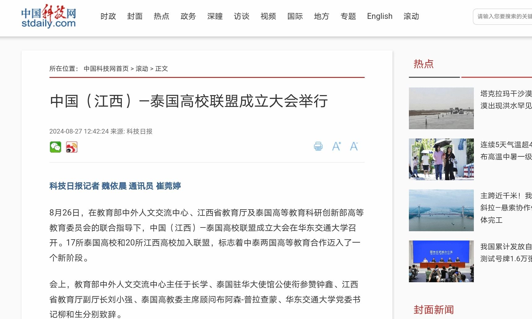 8月26日,在教育部中外人文交流中心、江西省教育厅及泰国高等教育科研创新部高等教育委员会的联合指导下,中国(江西)—泰国高校联盟成立大会在beat365中文唯一官网召开。17所泰国高校和20所江西高校加入联盟,标志着中泰两国高等教育合作迈入了一个新阶段。