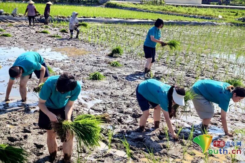 “追风青年”下到田间栽插秧苗。肖志鹏 摄