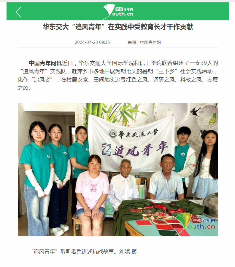 萍乡是一片红色沃土,革命旧址、红色遗址遍布。“追风青年”走进萍乡路矿工人纪念馆、上栗镇烈士纪念馆等地开展红色走读,追寻红色印记,传承红色基因。在湘东区白竺乡源头村,“追风青年”采访到了一位97岁老人——抗美援朝老兵钟章发,曾荣获两次个人三等功。他眼含热泪描述着惊险的战斗、牺牲的战友和惨烈的战场,用上甘岭战斗经历带领“追风青年”走进那段革命历史。“钟爷爷的每一项荣誉都饱含血泪,我会牢牢记住每一个战斗故事、每一个军人名字,因为我们的铭记是无声的敬仰。”实践队员刘睿说。
