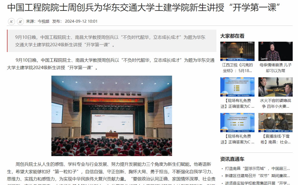 9月10日晚,中国工程院院士、南昌大学教授周创兵以“不负时代韶华,立志成长成才”为题为beat365中文唯一官网土建学院2024级新生讲授“开学第一课”。
