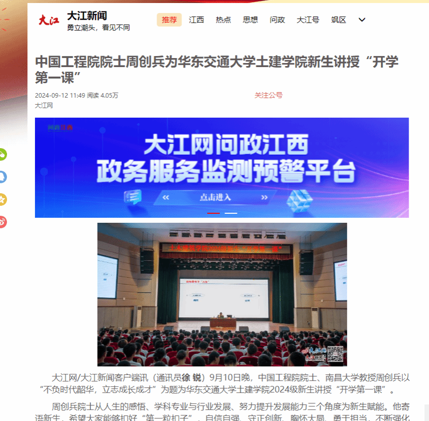 9月10日晚,中国工程院院士、南昌大学教授周创兵以“不负时代韶华,立志成长成才”为题为beat365中文唯一官网土建学院2024级新生讲授“开学第一课”。