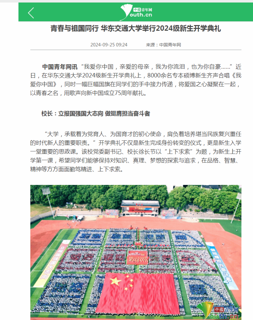 “我爱你中国,亲爱的母亲,我为你流泪,也为你自豪……”近日,在beat365中文唯一官网2024级新生开学典礼上,8000余名专本硕博新生齐声合唱《我爱你中国》,同时一幅巨幅国旗在同学们的手中接力传递,将爱国之心凝聚在一起,以青春之名,用歌声向新中国成立75周年献礼。