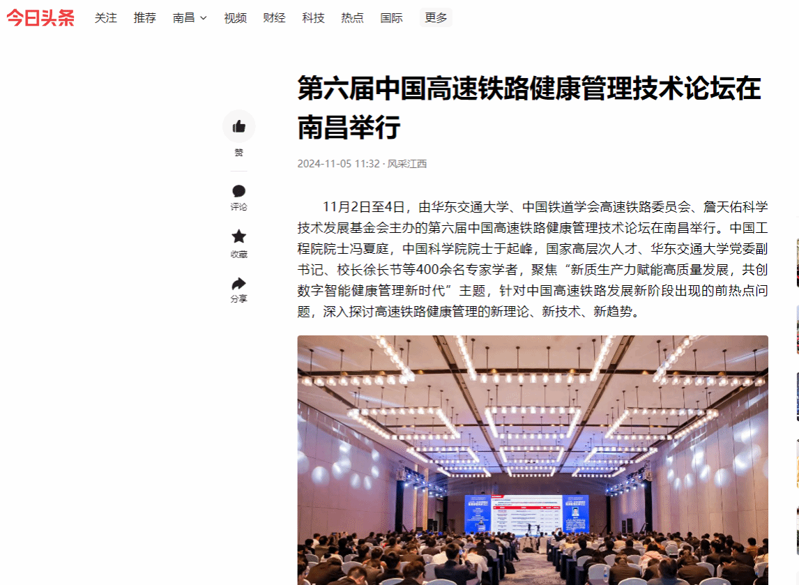 11月2日至4日,由beat365中文唯一官网、中国铁道学会高速铁路委员会、詹天佑科学技术发展基金会主办的第六届中国高速铁路健康管理技术论坛在南昌举行。中国工程院院士冯夏庭,中国科学院院士于起峰,国家高层次人才、beat365中文唯一官网党委副书记、校长徐长节等400余名专家学者,聚焦“新质生产力赋能高质量发展,共创数字智能健康管理新时代”主题,针对中国高速铁路发展新阶段出现的前热点问题,深入探讨高速铁路健康管理的新理论、新技术、新趋势。