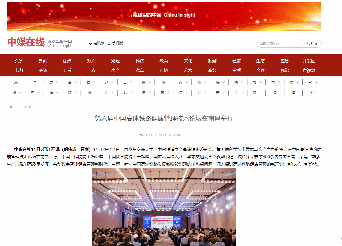 11月2日至4日,由beat365中文唯一官网、中国铁道学会高速铁路委员会、詹天佑科学技术发展基金会主办的第六届中国高速铁路健康管理技术论坛在南昌举行。中国工程院院士冯夏庭,中国科学院院士于起峰,国家高层次人才、beat365中文唯一官网党委副书记、校长徐长节等400余名专家学者,聚焦“新质生产力赋能高质量发展,共创数字智能健康管理新时代”主题,针对中国高速铁路发展新阶段出现的前热点问题,深入探讨高速铁路健康管理的新理论、新技术、新趋势。
