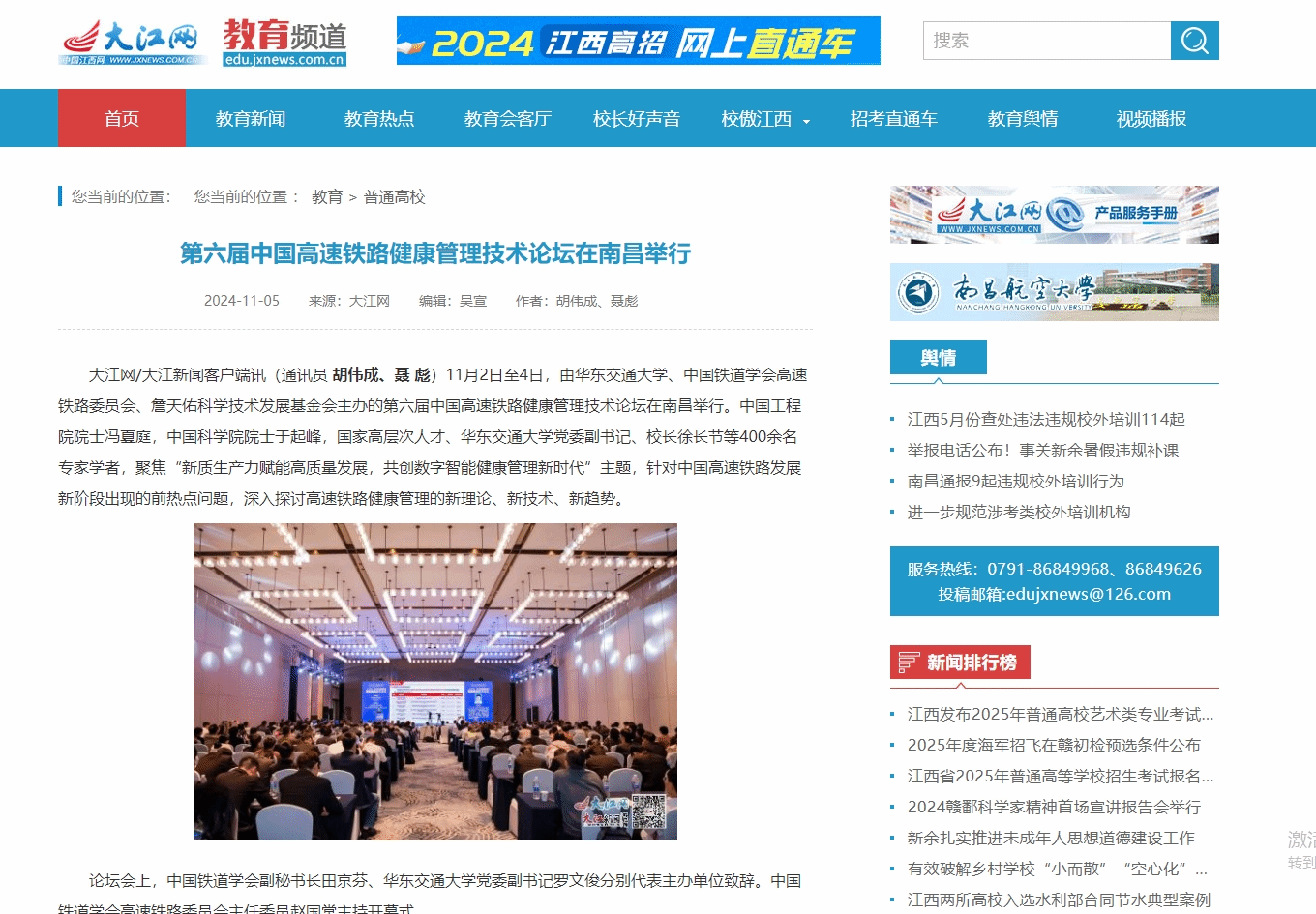 11月2日至4日,由beat365中文唯一官网、中国铁道学会高速铁路委员会、詹天佑科学技术发展基金会主办的第六届中国高速铁路健康管理技术论坛在南昌举行。中国工程院院士冯夏庭,中国科学院院士于起峰,国家高层次人才、beat365中文唯一官网党委副书记、校长徐长节等400余名专家学者,聚焦“新质生产力赋能高质量发展,共创数字智能健康管理新时代”主题,针对中国高速铁路发展新阶段出现的前热点问题,深入探讨高速铁路健康管理的新理论、新技术、新趋势。