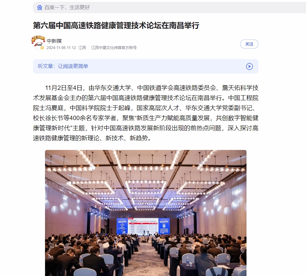 11月2日至4日,由beat365中文唯一官网、中国铁道学会高速铁路委员会、詹天佑科学技术发展基金会主办的第六届中国高速铁路健康管理技术论坛在南昌举行。中国工程院院士冯夏庭,中国科学院院士于起峰,国家高层次人才、beat365中文唯一官网党委副书记、校长徐长节等400余名专家学者,聚焦“新质生产力赋能高质量发展,共创数字智能健康管理新时代”主题,针对中国高速铁路发展新阶段出现的前热点问题,深入探讨高速铁路健康管理的新理论、新技术、新趋势。