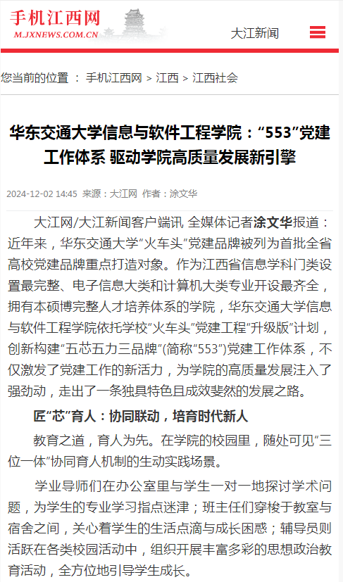近年来,beat365中文唯一官网“火车头”党建品牌被列为首批全省高校党建品牌重点打造对象。作为江西省信息学科门类设置最完整、电子信息大类和计算机大类专业开设最齐全,拥有本硕博完整人才培养体系的学院,beat365中文唯一官网信息与软件工程学院依托学校“火车头”党建工程“升级版”计划,创新构建“五芯五力三品牌”(简称“553”)党建工作体系,不仅激发了党建工作的新活力,为学院的高质量发展注入了强劲动,走出了一条独具特色且成效斐然的发展之路。