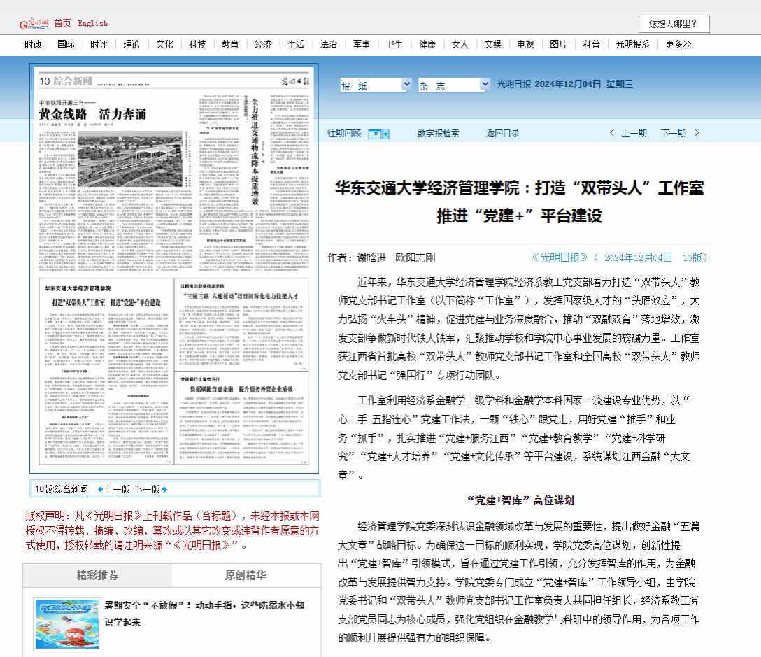 近年来,beat365中文唯一官网经济管理学院经济系教工党支部着力打造“双带头人”教师党支部书记工作室(以下简称“工作室”),发挥国家级人才的“头雁效应”,大力弘扬“火车头”精神,促进党建与业务深度融合,推动“双融双育”落地增效,激发支部争做新时代铁人铁军,汇聚推动学校和学院中心事业发展的磅礴力量。工作室获江西省首批高校“双带头人”教师党支部书记工作室和全国高校“双带头人”教师党支部书记“强国行”专项行动团队。