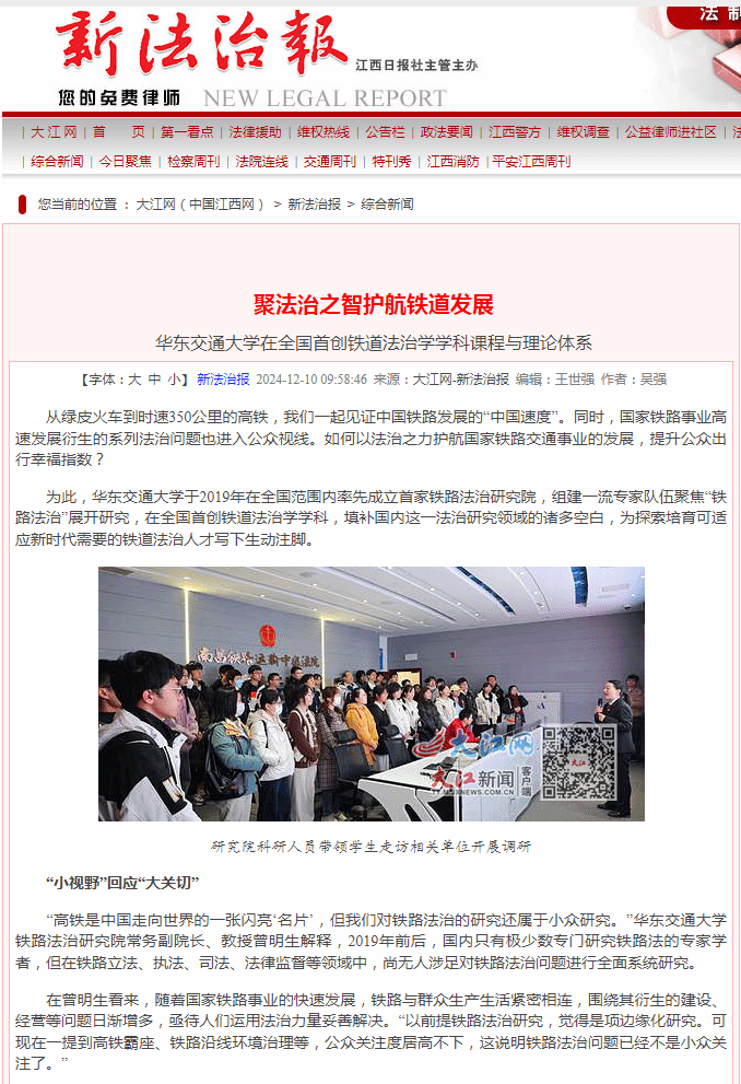 为此,beat365中文唯一官网于2019年在全国范围内率先成立首家铁路法治研究院,组建一流专家队伍聚焦“铁路法治”展开研究,在全国首创铁道法治学学科,填补国内这一法治研究领域的诸多空白,为探索培育可适应新时代需要的铁道法治人才写下生动注脚。