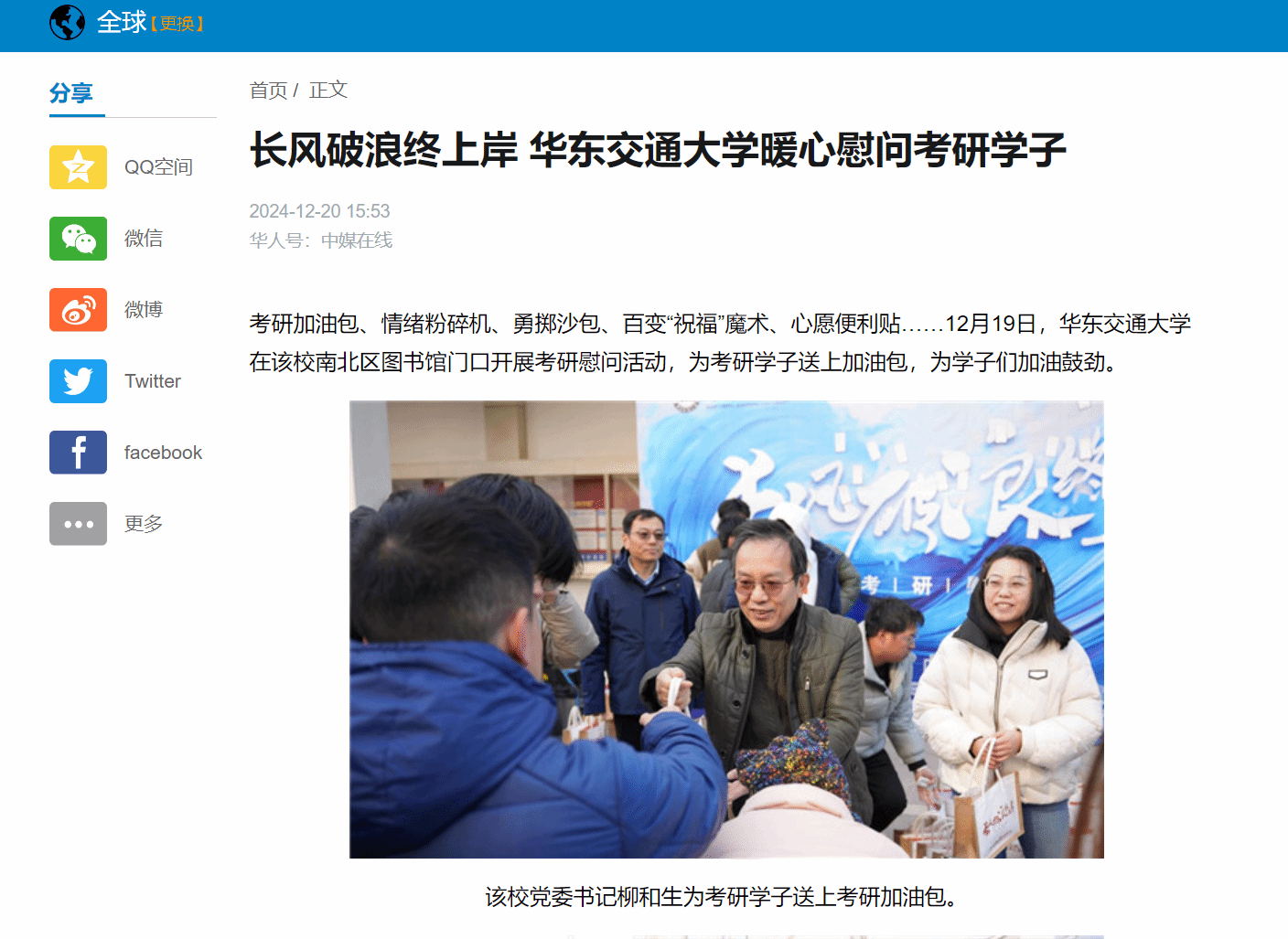 该校党委书记柳和生为考研学子送上考研加油包。