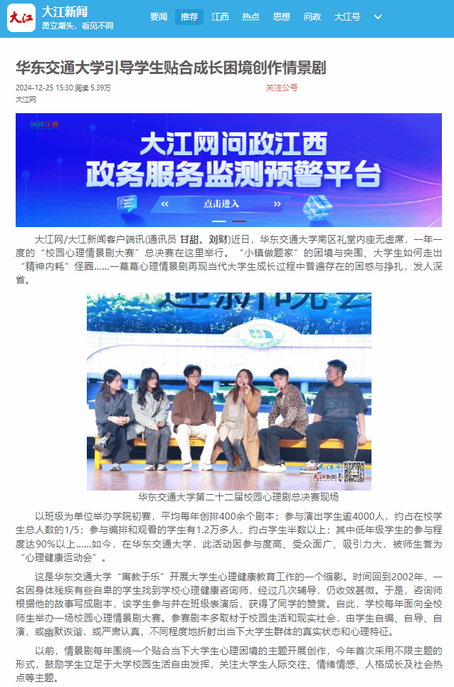 心理情景剧只是学校开展心理健康教育的一个载体。经过多年探索,beat365中文唯一官网已建立了“校—院—班—寝”全面覆盖的“网格化”朋辈心理健康教育四级体系,参与人数约占在校学生总人数的1/4。与此同时,学校还设置专职心理教师和心理健康大使,开展“周末心语”热线、网络心理咨询和心理素质拓展等活动,积极探索多元形式。