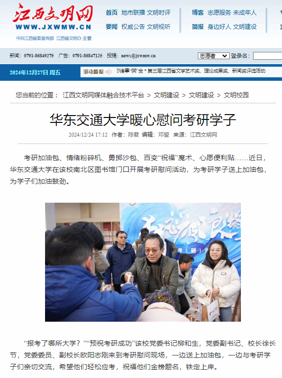 “报考了哪所大学?”“预祝考研成功”该校党委书记柳和生,党委副书记、校长徐长节,党委委员、副校长欧阳志刚来到考研慰问现场,一边送上加油包,一边与考研学子们亲切交流,希望他们轻松应考,祝福他们金榜题名,铁定上岸。