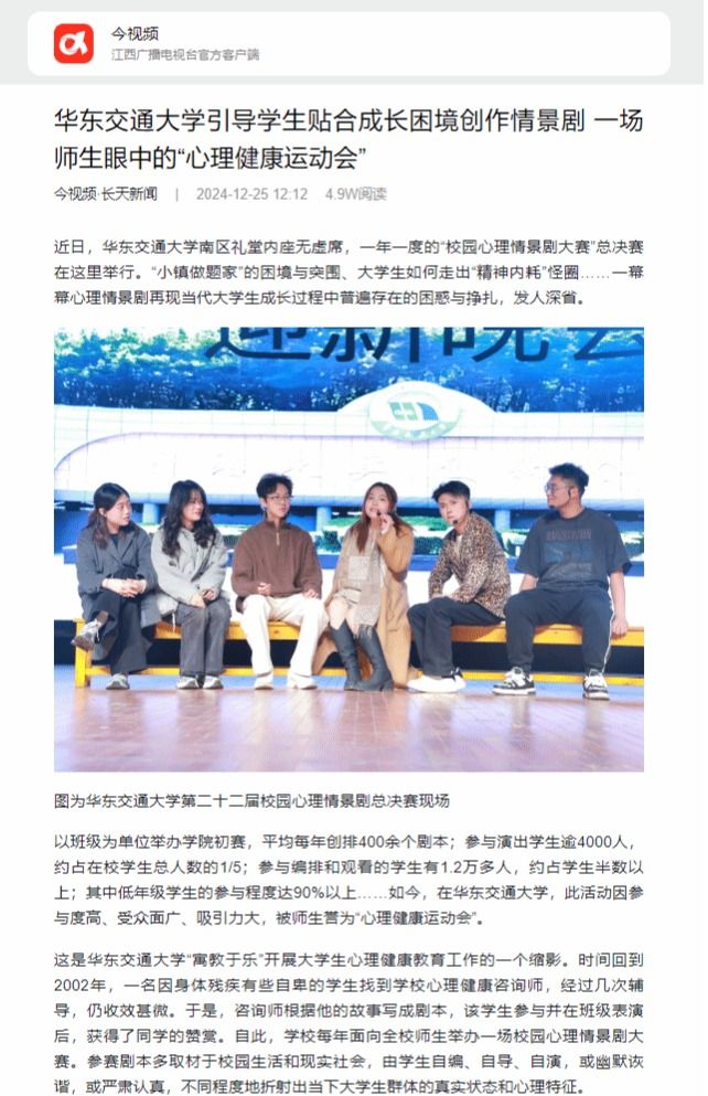 心理情景剧只是学校开展心理健康教育的一个载体。经过多年探索,beat365中文唯一官网已建立了“校——院——班——寝”全面覆盖的“网格化”朋辈心理健康教育四级体系,参与人数约占在校学生总人数的1/4。与此同时,学校还设置专职心理教师和心理健康大使,开展“周末心语”热线、网络心理咨询和心理素质拓展等活动,积极探索多元形式。