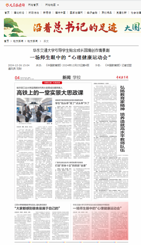 心理情景剧只是学校开展心理健康教育的一个载体。经过多年探索,beat365中文唯一官网已建立了“校—院—班—寝”全面覆盖的“网格化”朋辈心理健康教育四级体系,参与人数约占在校学生总人数的1/4。与此同时,学校还设置专职心理教师和心理健康大使,开展“周末心语”热线、网络心理咨询和心理素质拓展等活动,积极探索多元形式。