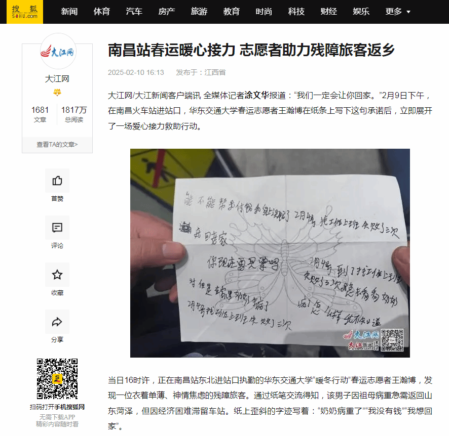 “放心!我们马上想办法。”王瀚博立即在车站内与多个部门联系,经过不断沟通协调,他与南昌市救助站取得联系,并反复确认救助流程。期间,闻讯赶来的志愿者万桂滨为受助者送来面包、热水等物资,并不时在纸条上写下“保佑奶奶平安”“工作人员马上就到”暖心话语安抚其情绪。