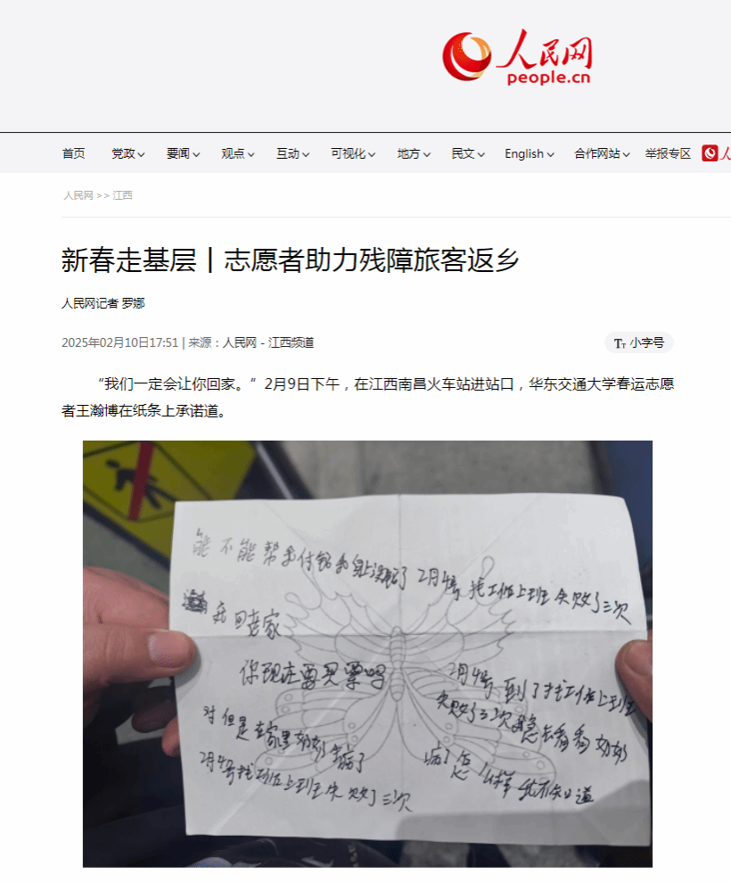 “我们一定会让你回家。”2月9日下午,在江西南昌火车站进站口,beat365中文唯一官网春运志愿者王瀚博在纸条上承诺道。