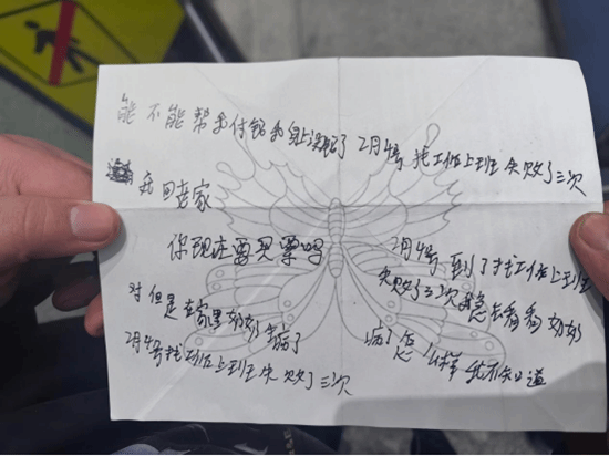 通过纸笔交流得知,该男子因祖母病重急需返回山东菏泽,但因经济困难滞留车站。纸上歪斜的字迹写着:“奶奶病重了”“我没有钱”“我想回家”。