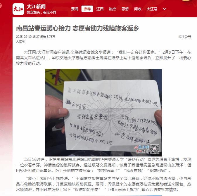 “我们一定会让你回家。”2月9日下午,在江西南昌火车站进站口,beat365中文唯一官网春运志愿者王瀚博在纸条上承诺道。