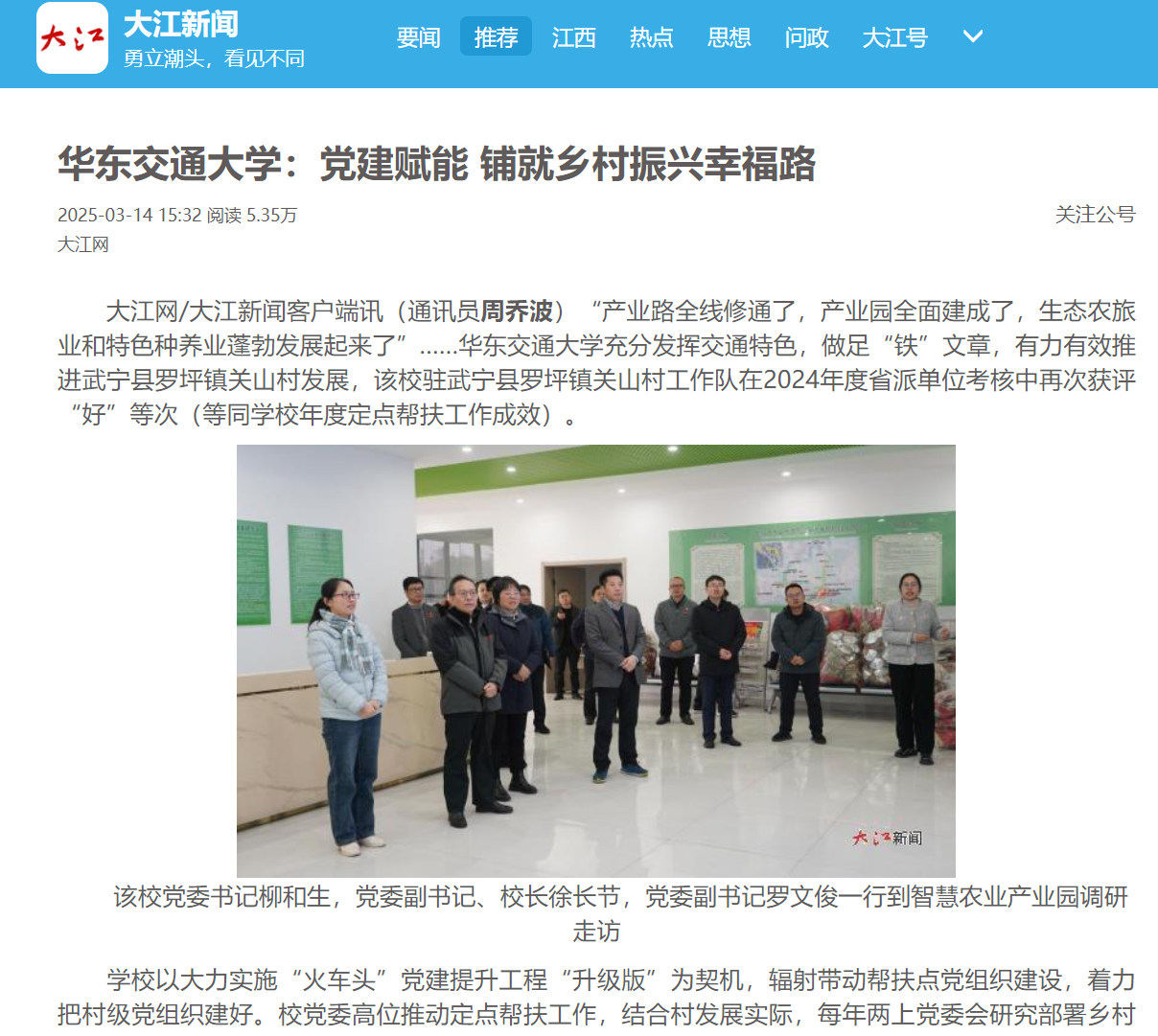 学校注重帮扶工作的协同联动,有计划地组织土建学院、交通学院等10余个博士帮扶团,赴帮扶点开展科技惠民服务,组织校附属医院、计财处等20余个党支部与村党支部开展结对帮扶,辐射带动农工党华东交大支部、江西省校友会等单位赴村开展党建共建。