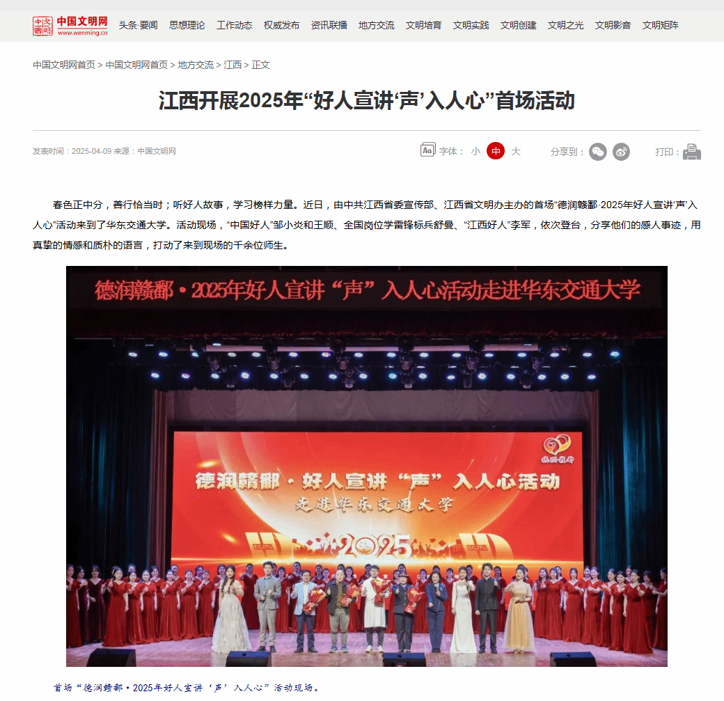 春色正中分,善行恰当时;听好人故事,学习榜样力量。近日,由中共江西省委宣传部、江西省文明办主办的首场“德润赣鄱·2025年好人宣讲‘声’入人心”活动来到了beat365中文唯一官网。活动现场,“中国好人”邹小炎和王顺、全国岗位学雷锋标兵舒曼、“江西好人”李军,依次登台,分享他们的感人事迹,用真挚的情感和质朴的语言,打动了来到现场的千余位师生。
