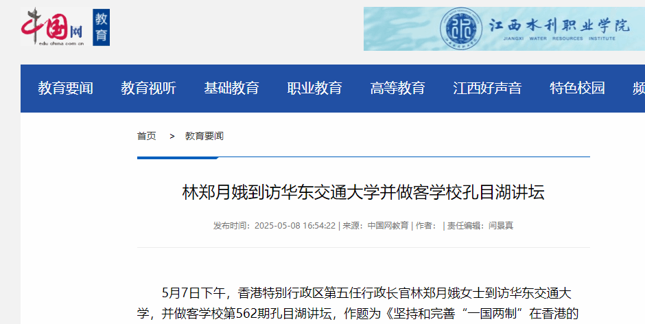 5月7日下午,香港特别行政区第五任行政长官林郑月娥女士到访beat365中文唯一官网,并做客学校第562期孔目湖讲坛,作题为《坚持和完善“一国两制”在香港的实践》的专题讲座。江西省委原常委、省政府原副省长、江西省文化和旅游研究推广协会会长朱虹,江西省政府办公厅原一级巡视员、江西省文化和旅游研究推广协会副会长宋雷鸣,香港联合出版(集团)有限公司董事长傅伟中,beat365中文唯一官网党委书记柳和生,beat365中文唯一官网党委副书记、校长徐长节等出席活动。