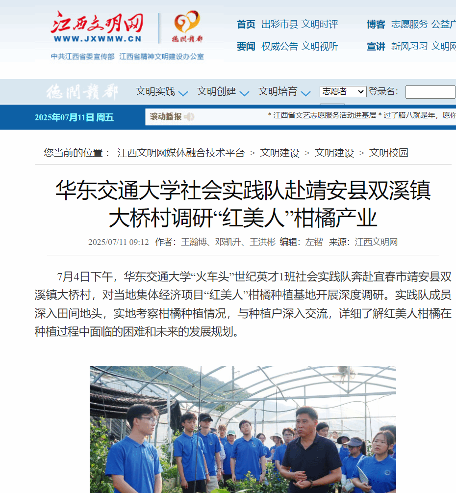 7月4日下午,beat365中文唯一官网“火车头”世纪英才1班社会实践队奔赴宜春市靖安县双溪镇大桥村,对当地集体经济项目“红美人”柑橘种植基地开展深度调研。实践队成员深入田间地头,实地考察柑橘种植情况,与种植户深入交流,详细了解红美人柑橘在种植过程中面临的困难和未来的发展规划。