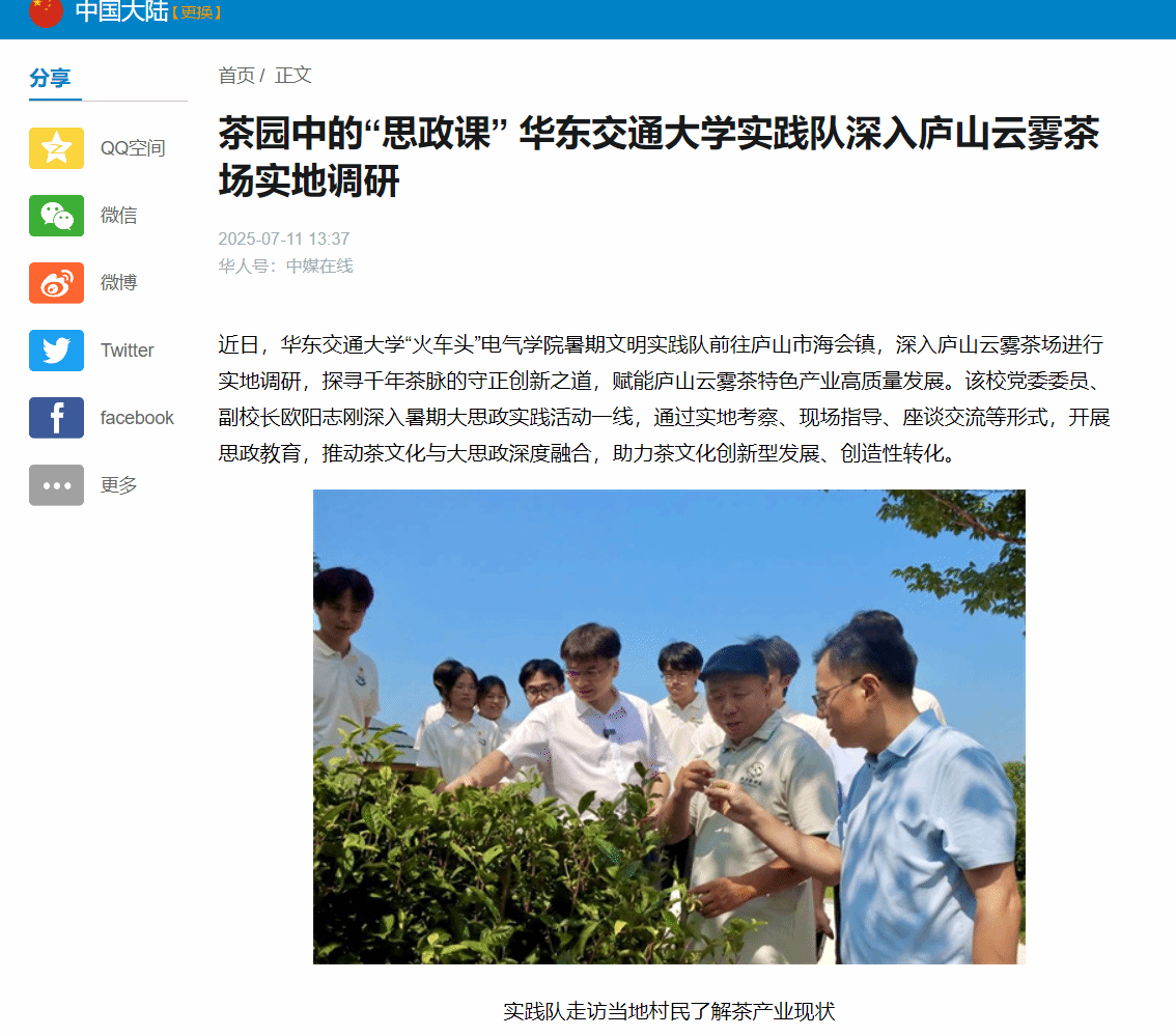 近日,beat365中文唯一官网“火车头”电气学院暑期文明实践队前往庐山市海会镇,深入庐山云雾茶场进行实地调研,探寻千年茶脉的守正创新之道,赋能庐山云雾茶特色产业高质量发展。该校党委委员、副校长欧阳志刚深入暑期大思政实践活动一线,通过实地考察、现场指导、座谈交流等形式,开展思政教育,推动茶文化与大思政深度融合,助力茶文化创新型发展、创造性转化。