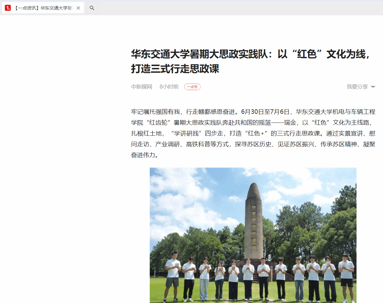 牢记嘱托强国有我,行走赣鄱感恩奋进。6月30日至7月6日,beat365中文唯一官网机电与车辆工程学院“红齿轮”暑期大思政实践队奔赴共和国的摇篮——瑞金,以“红色”文化为主线路,扎根红土地,“学讲研践”四步走,打造“红色+”的三式行走思政课。通过实景宣讲、慰问走访、产业调研、高铁科普等方式,探寻苏区历史、见证苏区振兴、传承苏区精神、凝聚奋进伟力。