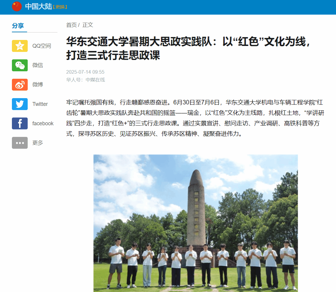 牢记嘱托强国有我,行走赣鄱感恩奋进。6月30日至7月6日,beat365中文唯一官网机电与车辆工程学院“红齿轮”暑期大思政实践队奔赴共和国的摇篮——瑞金,以“红色”文化为主线路,扎根红土地,“学讲研践”四步走,打造“红色+”的三式行走思政课。通过实景宣讲、慰问走访、产业调研、高铁科普等方式,探寻苏区历史、见证苏区振兴、传承苏区精神、凝聚奋进伟力。