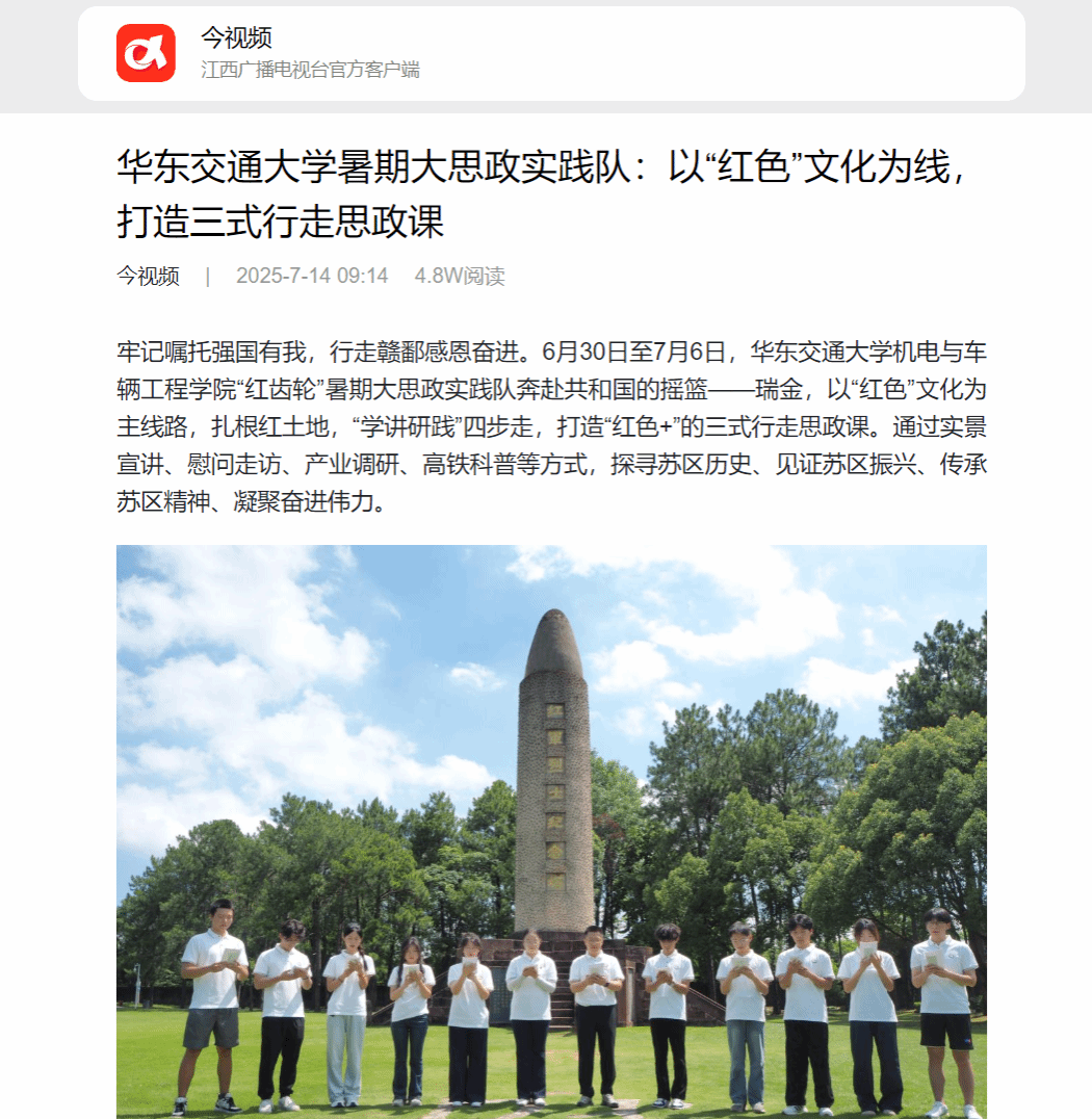 牢记嘱托强国有我,行走赣鄱感恩奋进。6月30日至7月6日,beat365中文唯一官网机电与车辆工程学院“红齿轮”暑期大思政实践队奔赴共和国的摇篮——瑞金,以“红色”文化为主线路,扎根红土地,“学讲研践”四步走,打造“红色+”的三式行走思政课。通过实景宣讲、慰问走访、产业调研、高铁科普等方式,探寻苏区历史、见证苏区振兴、传承苏区精神、凝聚奋进伟力。