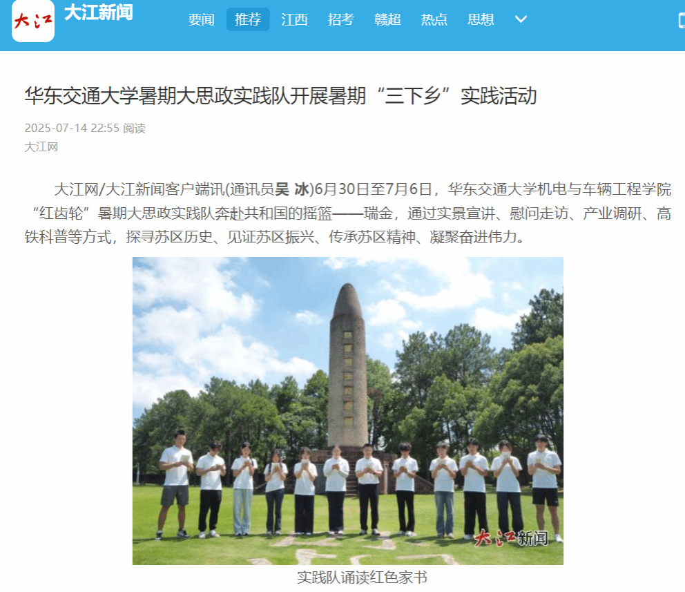 6月30日至7月6日,beat365中文唯一官网机电与车辆工程学院“红齿轮”暑期大思政实践队奔赴共和国的摇篮——瑞金,通过实景宣讲、慰问走访、产业调研、高铁科普等方式,探寻苏区历史、见证苏区振兴、传承苏区精神、凝聚奋进伟力。