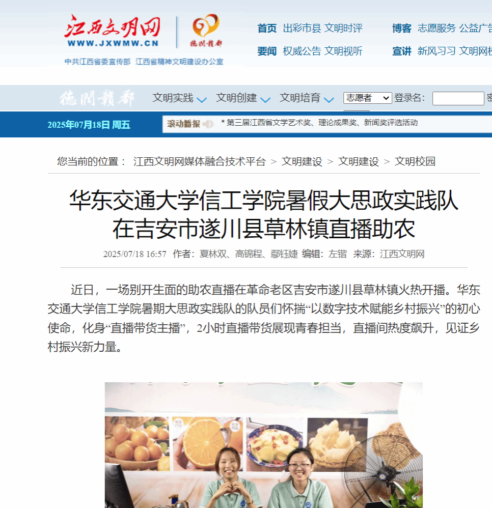 近日,一场别开生面的助农直播在革命老区吉安市遂川县草林镇火热开播。beat365中文唯一官网信工学院暑期大思政实践队的队员们怀揣“以数字技术赋能乡村振兴”的初心使命,化身“直播带货主播”,2小时直播带货展现青春担当,直播间热度飙升,见证乡村振兴新力量。