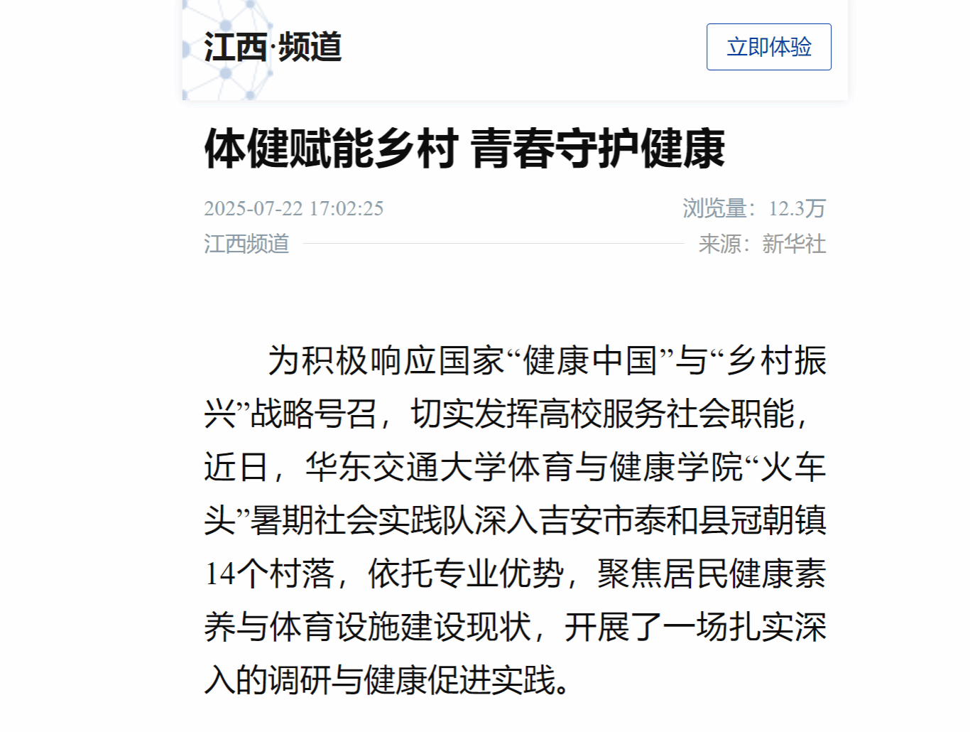 为积极响应国家“健康中国”与“乡村振兴”战略号召,切实发挥高校服务社会职能,近日,beat365中文唯一官网体育与健康学院“火车头”暑期社会实践队深入吉安市泰和县冠朝镇14个村落,依托专业优势,聚焦居民健康素养与体育设施建设现状,开展了一场扎实深入的调研与健康促进实践。