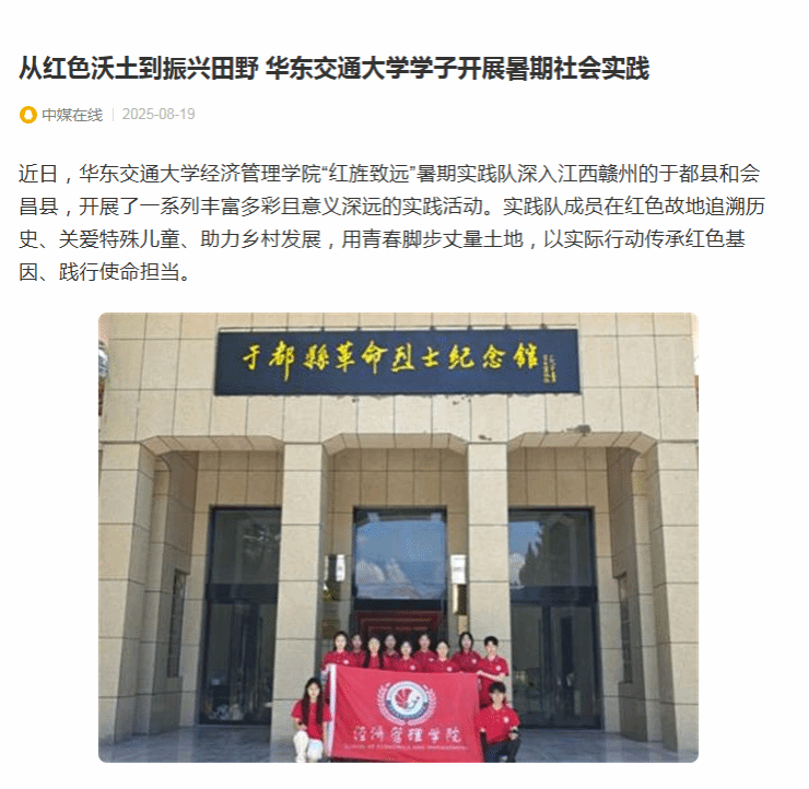 近日,beat365中文唯一官网经济管理学院“红旌致远”暑期实践队深入江西赣州的于都县和会昌县,开展了一系列丰富多彩且意义深远的实践活动。实践队成员在红色故地追溯历史、关爱特殊儿童、助力乡村发展,用青春脚步丈量土地,以实际行动传承红色基因、践行使命担当。