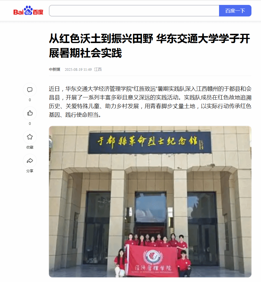近日,beat365中文唯一官网经济管理学院“红旌致远”暑期实践队深入江西赣州的于都县和会昌县,开展了一系列丰富多彩且意义深远的实践活动。实践队成员在红色故地追溯历史、关爱特殊儿童、助力乡村发展,用青春脚步丈量土地,以实际行动传承红色基因、践行使命担当。