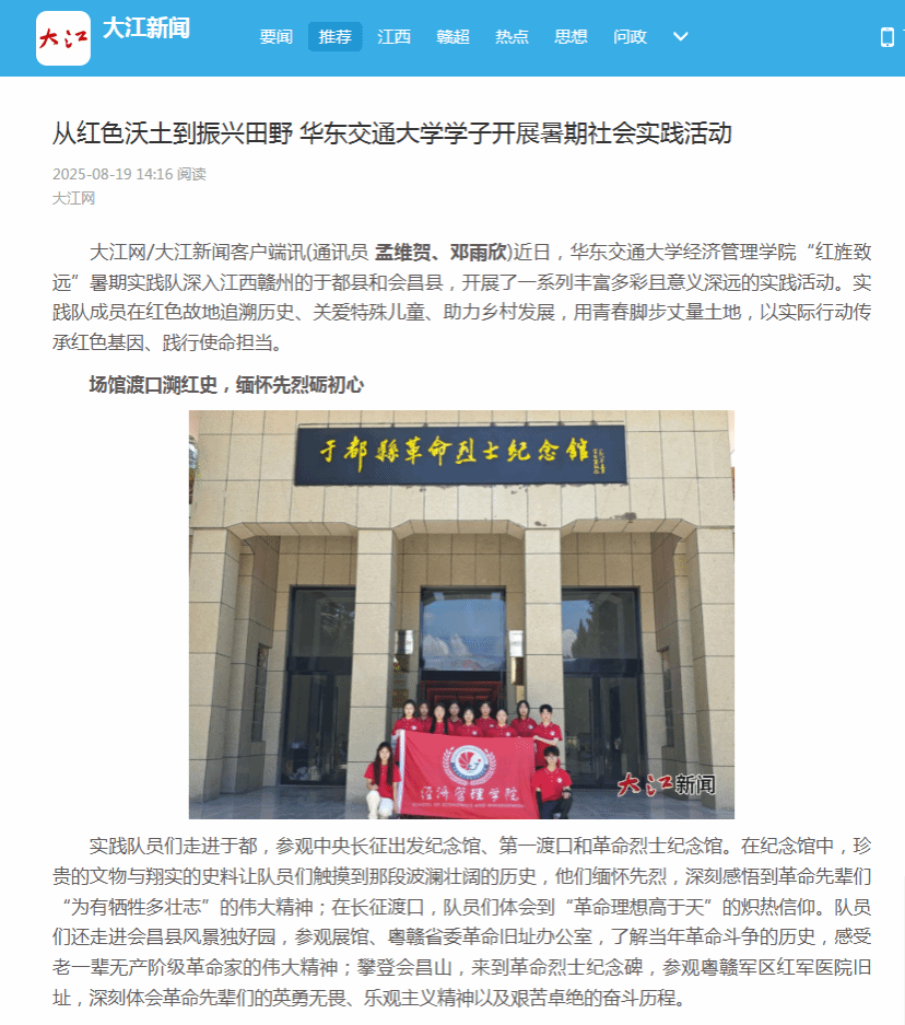 近日,beat365中文唯一官网经济管理学院“红旌致远”暑期实践队深入江西赣州的于都县和会昌县,开展了一系列丰富多彩且意义深远的实践活动。实践队成员在红色故地追溯历史、关爱特殊儿童、助力乡村发展,用青春脚步丈量土地,以实际行动传承红色基因、践行使命担当。