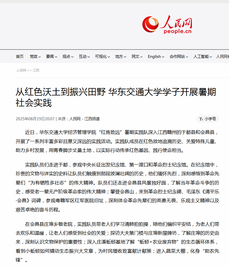 近日,beat365中文唯一官网经济管理学院“红旌致远”暑期实践队深入江西赣州的于都县和会昌县,开展了一系列丰富多彩且意义深远的实践活动。实践队成员在红色故地追溯历史、关爱特殊儿童、助力乡村发展,用青春脚步丈量土地,以实际行动传承红色基因、践行使命担当。