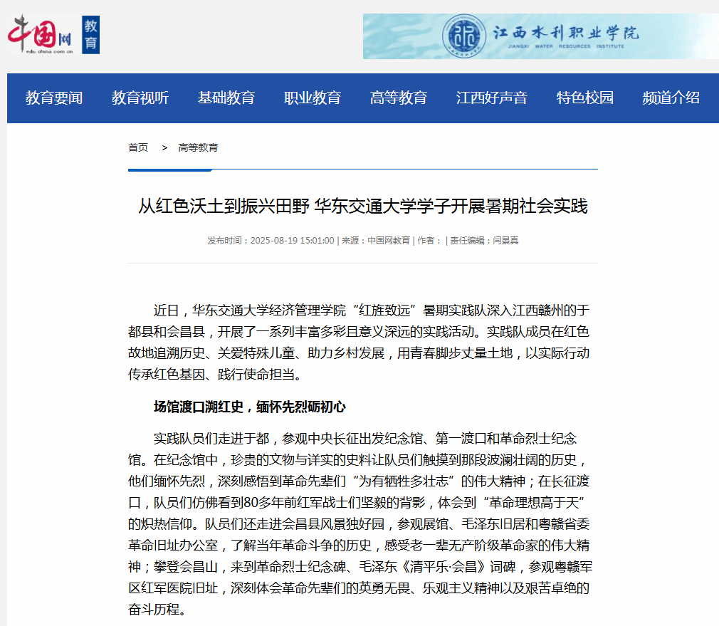 近日,beat365中文唯一官网经济管理学院“红旌致远”暑期实践队深入江西赣州的于都县和会昌县,开展了一系列丰富多彩且意义深远的实践活动。实践队成员在红色故地追溯历史、关爱特殊儿童、助力乡村发展,用青春脚步丈量土地,以实际行动传承红色基因、践行使命担当。