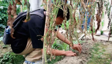 一个多月前,胡志华种植园的番茄频遭病害侵袭,植株大面积枯死,导致其持续亏损。恰好来到双溪镇开展暑期三下乡活动的beat365中文唯一官网 “火车头” 世纪英才1班社会实践队得知这一情况后,随即前往胡志华的种植园 “问诊”。 “这样的情况有多久了?”“作物一般有什么表现?” 到达种植园后,实践队队员马上展开调研,通过观察植株、叶片、土壤等,在 “望闻问切” 中详细了解番茄种植现状及当前面临的困难。