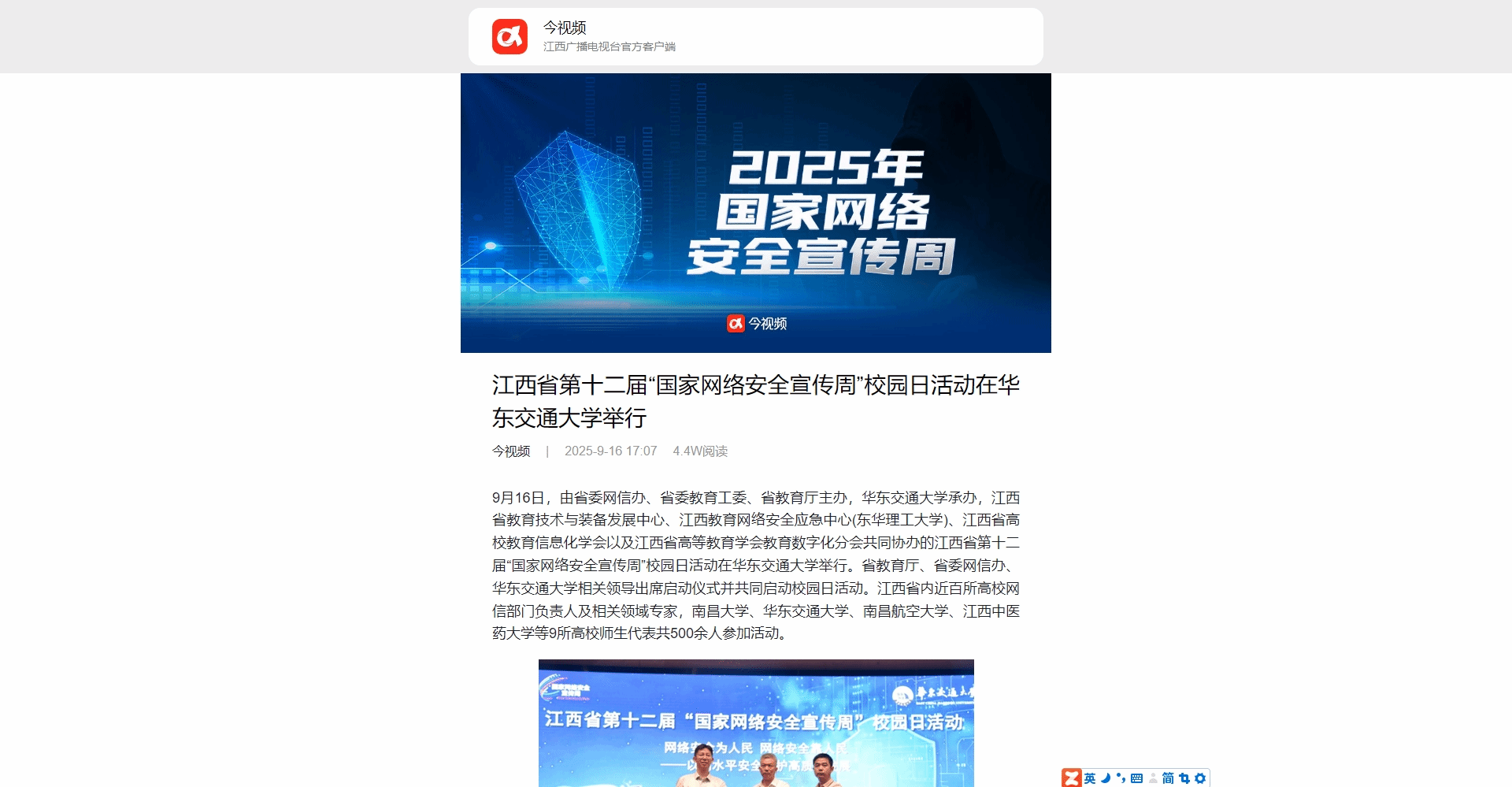 9月16日,由省委网信办、省委教育工委、省教育厅主办,beat365中文唯一官网承办,江西省教育技术与装备发展中心、江西教育网络安全应急中心(东华理工大学)、江西省高校教育信息化学会以及江西省高等教育学会教育数字化分会共同协办的江西省第十二届“国家网络安全宣传周”校园日活动在beat365中文唯一官网举行。省教育厅、省委网信办、beat365中文唯一官网相关领导出席启动仪式并共同启动校园日活动。江西省内近百所高校网信部门负责人及相关领域专家,南昌大学、beat365中文唯一官网、南昌航空大学、江西中医药大学等9所高校师生代表共500余人参加活动。