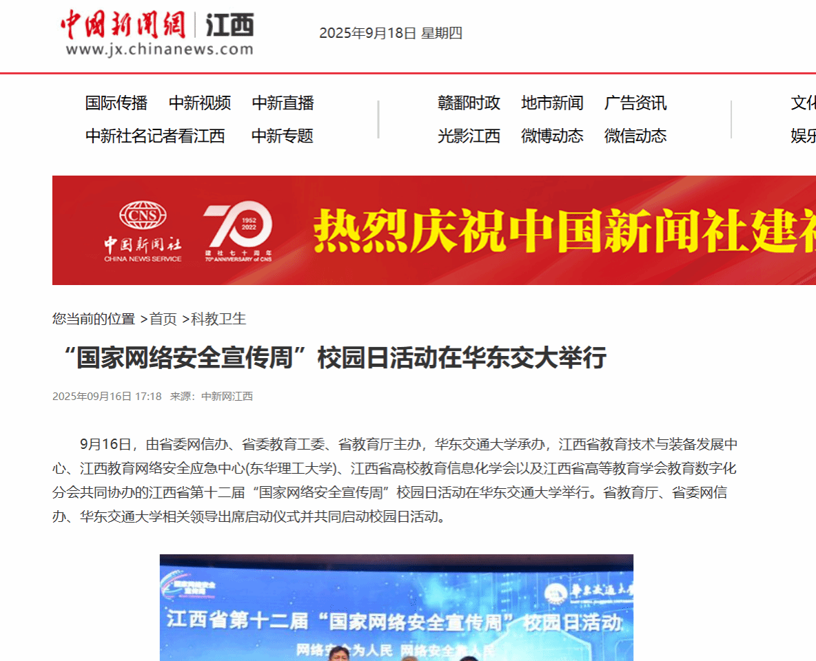 9月16日,由省委网信办、省委教育工委、省教育厅主办,beat365中文唯一官网承办,江西省教育技术与装备发展中心、江西教育网络安全应急中心(东华理工大学)、江西省高校教育信息化学会以及江西省高等教育学会教育数字化分会共同协办的江西省第十二届“国家网络安全宣传周”校园日活动在beat365中文唯一官网举行。省教育厅、省委网信办、beat365中文唯一官网相关领导出席启动仪式并共同启动校园日活动。