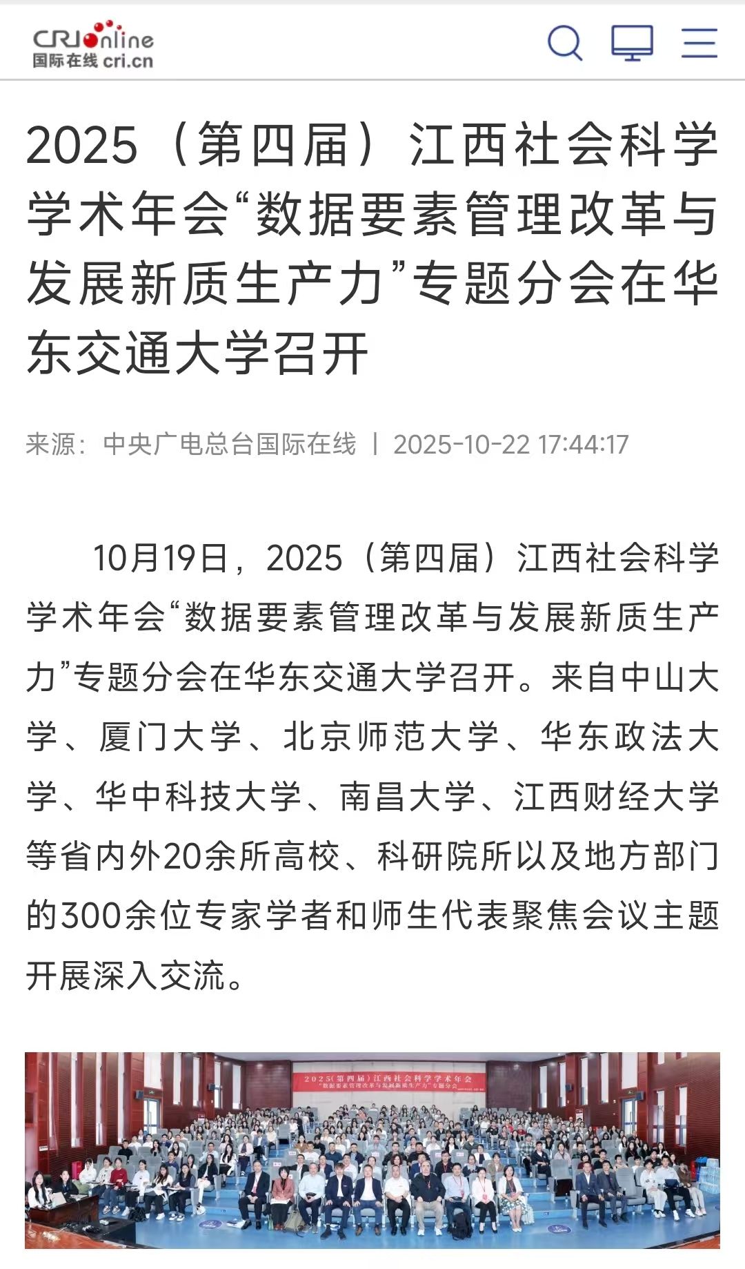 10月19日,2025(第四届)江西社会科学学术年会“数据要素管理改革与发展新质生产力”专题分会在beat365中文唯一官网召开。来自中山大学、厦门大学、北京师范大学、华东政法大学、华中科技大学、南昌大学、江西财经大学等省内外20余所高校、科研院所以及地方部门的300余位专家学者和师生代表聚焦会议主题开展深入交流。