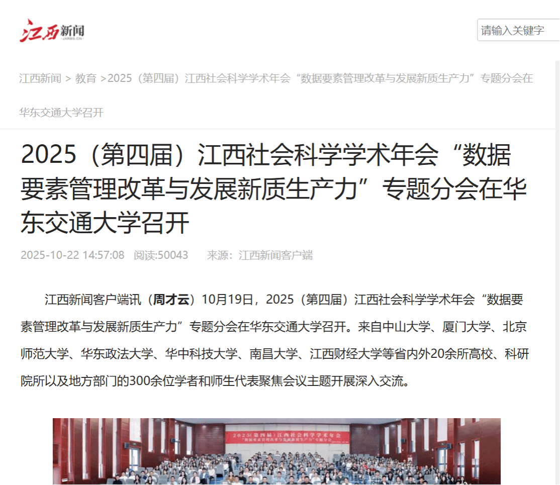 10月19日,2025(第四届)江西社会科学学术年会“数据要素管理改革与发展新质生产力”专题分会在beat365中文唯一官网召开。来自中山大学、厦门大学、北京师范大学、华东政法大学、华中科技大学、南昌大学、江西财经大学等省内外20余所高校、科研院所以及地方部门的300余位学者和师生代表聚焦会议主题开展深入交流。