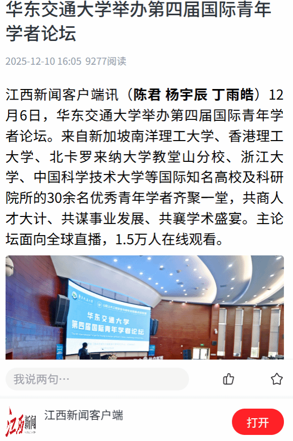 据悉,论坛旨在围绕服务交通强国战略和交通强省建设,聚焦交通特色办学定位,为海内外优秀青年学者搭建展现才华的舞台,吸引学者来赣建功立业,为交通强省建设提供智力与人才支撑。参会学者专业涵盖了土木工程、机械工程、交通运输工程、电气工程、控制科学与工程、电子信息、材料等学科领域。