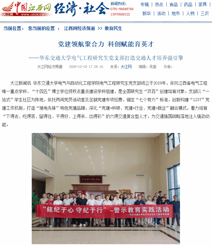 大江新闻讯 beat365中文唯一官网电气与自动化工程学院电气工程研究生党支部成立于2019年,依托江西省电气工程唯一重点学科、“十四五”博士学位授权点重点建设学科组建,是全国研究生“双百”创建培育对象。支部以“一站式”学生社区为阵地,依托两间党员活动室及足额党建专项经费,锚定“七个有力”标准,创新构建“1237”党建工作机制,打造“驰电先锋”特色党建品牌,深化“党建+科研、党建+行业、党建+就业”融合模式,着力培育“下得去、吃得苦、留得住、干得好、上得来、出得彩”的六得交通复合型人才,为交通强国战略落地注入强劲动能。