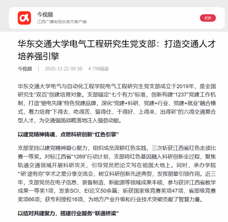 支部坚持以建党精神凝心聚力,组织成员深耕红色实践,三次斩获江西省红色走读比赛一等奖。对标江西省“1269”行动计划,支部将红色基因融入科研创新全过程,聚焦轨道交通领域开展科研攻关,引导党员把论文写在祖国大地上。同时,承办学院“‘研’途有你”学术之星分享交流会,树立科研创新先进典型,发挥朋辈引领作用。近三年,支部党员在电子信息、装备制造、新能源等领域成果丰硕,参与获评江西省教学成果一等奖1项,发表SCI、EI论文50余篇;斩获国家级竞赛奖项47项、省部级竞赛奖项66项;获专利授权16项,为地方产业升级和行业技术突破贡献了智慧力量。
