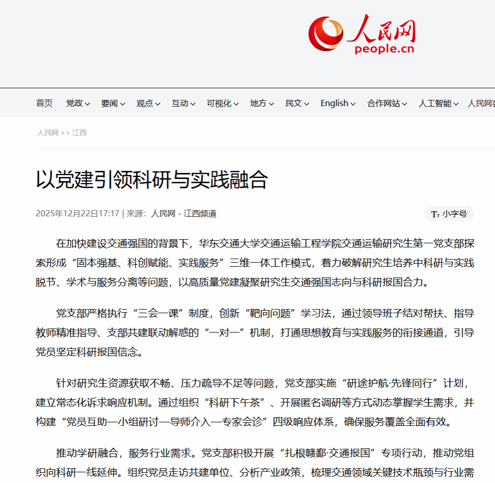 通过党建工作与科研实践的深度融合,党支部有效激发了研究生党员的创新活力与服务意识,为交通领域人才培养与行业发展贡献了积极力量。
